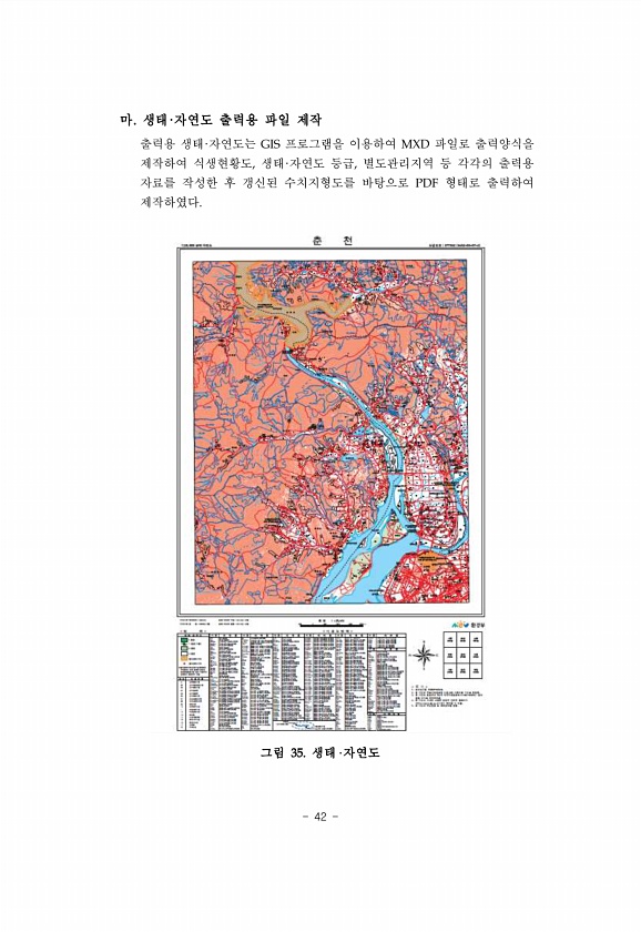 42 마. 생태·자연도 출력용 파일 제작 출력용 생태·자연도는 GIS 프로그램을 이용하여 MXD 파일로 출력양식을 제작하여 식생현황도, 생태·자연도 등급, 별도관리지역 등 각각의 출력용 자료를 작성한 후 갱신된 수치지형도를 바탕으로 PDF 형태로 출력하여 제작하였다. 그림 35. 생태자연도