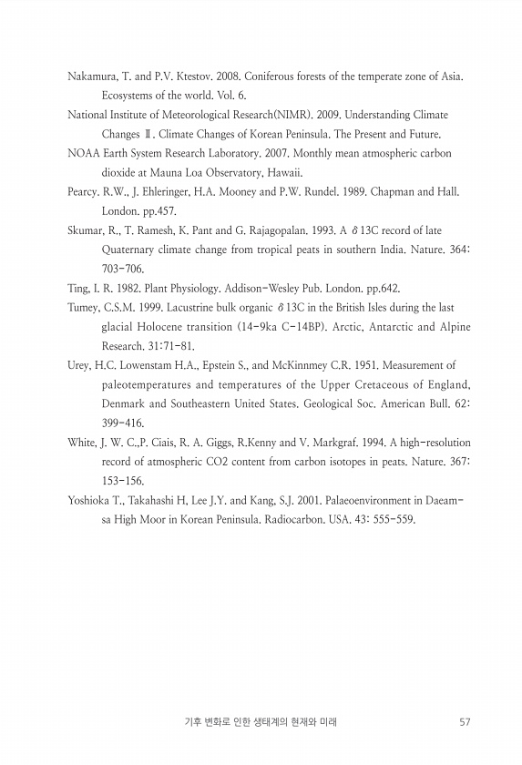 기후 변화로 인한 생태계의 현재와 미래 57 Nakamura, T. and P.V. Ktestov. 2008. Coniferous forests of the temperate zone of Asia. Ecosystems of the world. Vol. 6. National Institute of Meteorological Research NIMR 2009. Understanding Climate Changes Ⅱ. Climate Changes of Korean Peninsula. The Present and Future. NOAA Earth System Research Laboratory. 2007. Monthly mean atmospheric carbon dioxide at Mauna Loa Observ...