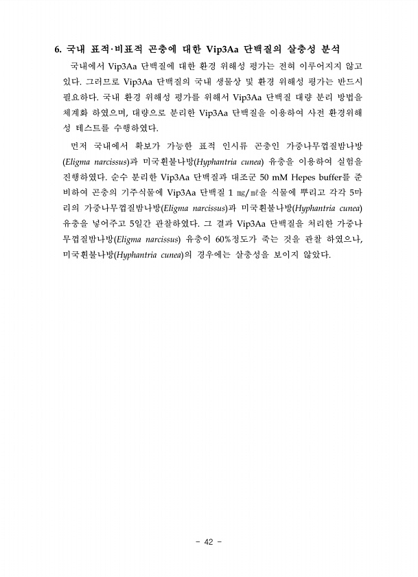 6. 국내 표적·비표적 곤충에 대한 Vip3Aa 단백질의 살충성 분석 국내에서 Vip3Aa 단백질에 대한 환경 위해성 평가는 전혀 이루어지지 않고 있다. 그러므로 Vip3Aa 단백질의 국내 생물상 및 환경 위해성 평가는 반드시 필요하다. 국내 환경 위해성 평가를 위해서 Vip3Aa 단백질 대량 분리 방법을 체계화 하였으며, 대량으로 분리한 Vip3Aa 단백질을 이용하여 사전 환경위해 성 테스트를 수행하였다. 먼저 국내에서 확보가 가능한 표적 인시류 곤충인 가중나무껍질밤나방 Eligma narcissus 과 미국흰불나방 Hyphantria cunea 유충을 이용하여 실험을 진행하였다. 순수 분리한 Vip3Aa 단백질과 대조군 50 mM Hepes buffer를 준 비하여 곤충의 기주식물에 Vip3Aa 단백질 ...