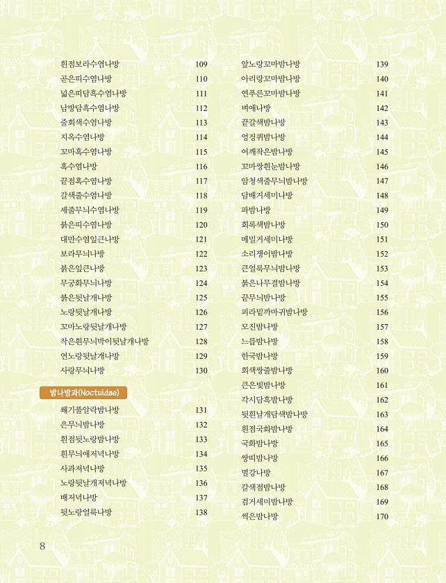 8 흰점보라수염나방 109 곧은띠수염나방 110 넓은띠담흑수염나방 111 남방담흑수염나방 112 줄회색수염나방 113 지옥수염나방 114 꼬마혹수염나방 115 혹수염나방 116 끝점혹수염나방 117 갈색줄수염나방 118 세줄무늬수염나방 119 붉은띠수염나방 120 대만수염잎큰나방 121 보라무늬나방 122 붉은잎큰나방 123 무궁화무늬나방 124 붉은뒷날개나방 125 노랑뒷날개나방 126 꼬마노랑뒷날개나방 127 작은흰무늬박이뒷날개나방 128 연노랑뒷날개나방 129 사랑무늬나방 130 밤나방과 Noctuidae 쐐기풀알락밤나방 131 은무늬밤나방 132 흰점뒷노랑밤나방 133 흰무늬애저녁나방 134 사과저녁나방 135 노랑뒷날개저녁나방 136 배저녁나방 137 뒷노랑얼룩나방 138 앞노랑꼬마밤나방 139 아...