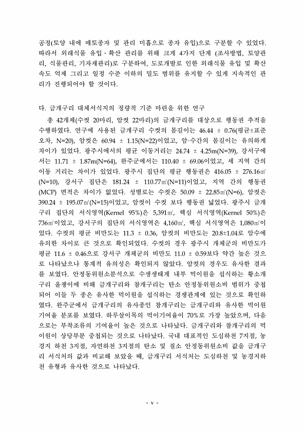 공정 토양 내에 매토종자 및 관리 미흡으로 종자 유입 으로 구분할 수 있었다. 따라서 외래식물 유입 확산 관리를 위해 크게 4가지 단계 조사방법, 토양관 리, 식물관리, 기자재관리 로 구분하여, 도로개발로 인한 외래식물 유입 및 확산 속도 억제 그리고 일정 수준 이하의 밀도 범위를 유지할 수 있게 지속적인 관 리가 진행되어야 할 것이다. 다 금개구리 대체서식지의 정량적 기준 마련을 위한 연구 총 개체 수컷 마리 암컷 마리 의 금개구리를 대상으로 행동권 추적을 수행하였다 연구에 사용된 금개구리 수컷의 몸길이는 평균 표준 오차 암컷은 이었고 암 수간의 몸길이는 유의하게 차이가 있었다 광주시에서의 평균 이동거리는 강서구에 서는 완주군에서는 이었고 세 지역 간의 이동 거리는 차이가 있었다 광주시 집단의 평균 행동권...
