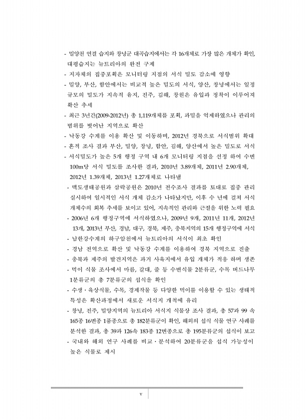v 밀양천 연결 습지와 창녕군 대곡습지에서는 각 16개체로 가장 많은 개체가 확인, 대평습지는 뉴트리아의 완전 구제 지자체의 집중포획은 모니터링 지점의 서식 밀도 감소에 영향 밀양, 부산, 함안에서는 비교적 높은 밀도의 서식, 양산, 창녕에서는 일정 규모의 밀도가 지속적 유지, 진주, 김해, 창원은 유입과 정착이 이루어져 확산 추세 최근 3년간 2009-2012년 총 1,119개체를 포획, 과밀을 억제하였으나 관리의 범위를 벗어난 지역으로 확산 낙동강 수계를 이용 확산 및 이동하며, 2012년 경북으로 서식범위 확대 흔적 조사 결과 부산, 밀양, 창녕, 함안, 김해, 양산에서 높은 밀도로 서식 서식밀도가 높은 5개 행정 구역 내 6개 모니터링 지점을 선정 하여 수변 100m당 서식 밀도를 조사한 결과, 20...