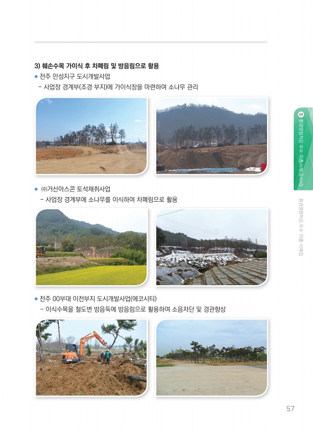 57 환경영향저감 우수·미흡사례 공사시 환경영향저감 우수·미흡 사례집 ● ㈜거산아스콘 토석채취사업 사업장 경계부에 소나무를 이식하여 차폐림으로 활용 3 훼손수목 가이식 후 차폐림 및 방음림으로 활용 ● 전주 만성지구 도시개발사업 사업장 경계부 조경 부지 에 가이식장을 마련하여 소나무 관리 ● 전주 00부대 이전부지 도시개발사업 에코시티 이식수목을 철도변 방음둑에 방음림으로 활용하여 소음차단 및경관향상