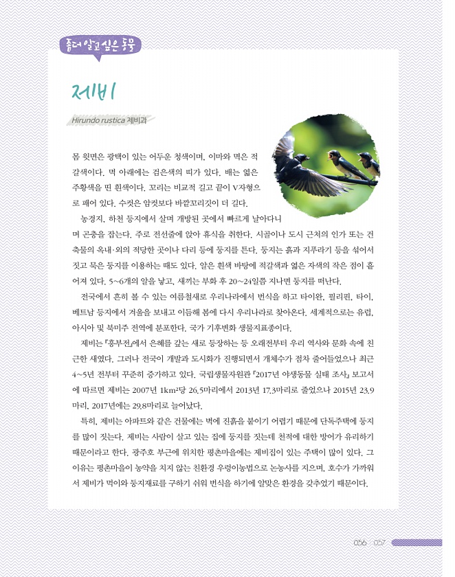 056 057 좀더알고싶은동물 제비 몸 윗면은 광택이 있는 어두운 청색이며, 이마와 멱은 적 갈색이다. 멱 아래에는 검은색의 띠가 있다. 배는 엷은 주황색을 띤 흰색이다. 꼬리는 비교적 길고 끝이 V자형으 로 패어 있다. 수컷은 암컷보다 바깥꼬리깃이 더 길다. 농경지, 하천 등지에서 살며 개방된 곳에서 빠르게 날아다니 며 곤충을 잡는다. 주로 전선줄에 앉아 휴식을 취한다. 시골이나 도시 근처의 인가 또는 건 축물의 옥내·외의 적당한 곳이나 다리 등에 둥지를 튼다. 둥지는 흙과 지푸라기 등을 섞어서 짓고 묵은 둥지를 이용하는 때도 있다. 알은 흰색 바탕에 적갈색과 엷은 자색의 작은 점이 흩 어져 있다. 56개의 알을 낳고, 새끼는 부화 후 2024일쯤 지나면 둥지를 떠난다. 전국에서 흔히 볼 수 있는 여름철새...