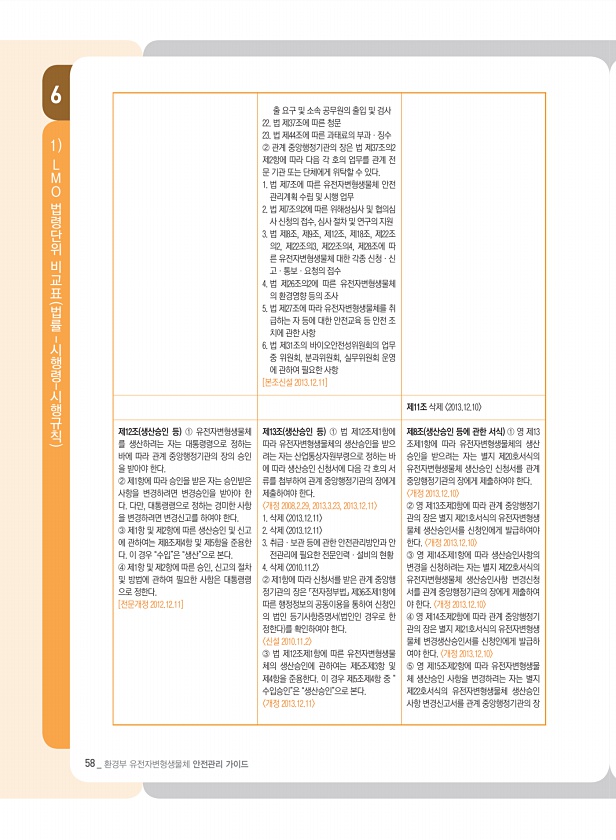 6 58 _ 환경부 유전자변형생물체 안전관리 가이드 1 L M O 법령단위 비교표 법률- 시행령- 시행규칙 제12조 생산승인 등 ① 유전자변형생물체 를 생산하려는 자는 대통령령으로 정하는 바에 따라 관계 중앙행정기관의 장의 승인 을 받아야 한다. ② 제1항에 따라 승인을 받은 자는 승인받은 사항을 변경하려면 변경승인을 받아야 한 다. 다만, 대통령령으로 정하는 경미한 사항 을 변경하려면 변경신고를 하여야 한다. ③ 제1항 및 제2항에 따른 생산승인 및 신고 에 관하여는 제8조제4항 및 제5항을 준용한 다. 이 경우 “수입”은 “생산”으로 본다. ④ 제1항 및 제2항에 따른 승인, 신고의 절차 및 방법에 관하여 필요한 사항은 대통령령 으로 정한다. [전문개정 2012.12.11] 출 요구 및 소속 공무원의 출...