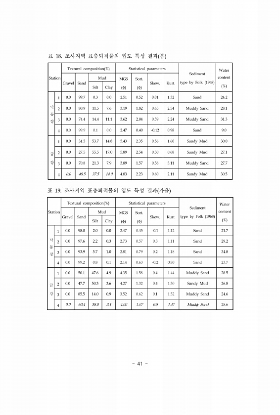41 Station Textural composition % Statistical parameters Sediment type by Folk 1968 Water content Gravel Sand % Mud MGS φ Sort. φ Skew. Kurt. Silt Clay 낙 동 강 1 0.0 99.7 0.3 0.0 2.51 0.52 0.01 1.32 Sand 24.2 2 0.0 80.9 11.5 7.6 3.19 1.82 0.65 2.54 Muddy Sand 28.1 3 0.0 74.4 14.4 11.1 3.62 2.04 0.59 2.24 Muddy Sand 31.3 4 0.0 99.9 0.1 0.0 2.47 0.40 -0.12 0.98 Sand 9.0 금 강 1 0.0 31.5 53.7 14.8 5.43 2...