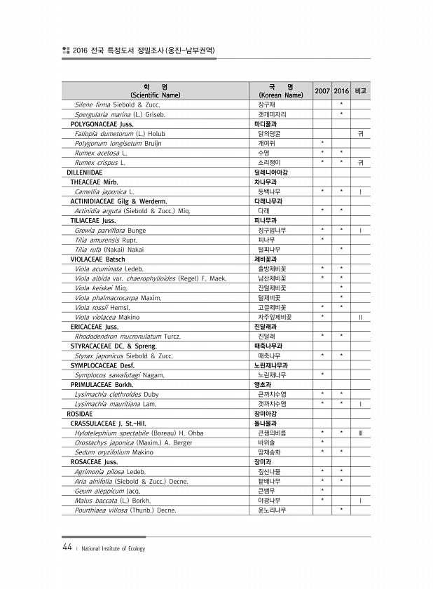 2016 전국 특정도서 정밀조사 옹진-남부권역 44 ? National Institute of Ecology 학 명 Scientific Name 국 명 Korean Name 2007 2016 비고 Silene firma Siebold & Zucc. 장구채 * Spergularia marina L. Griseb. 갯개미자리 * POLYGONACEAE Juss. 마디풀과 Fallopia dumetorum L. Holub 닭의덩굴 귀 Polygonum longisetum Bruijn 개여뀌 * Rumex acetosa L. 수영 * * Rumex crispus L. 소리쟁이 * * 귀 DILLENIIDAE 딜레니아아강 THEACEAE Mirb. 차나무과 Camellia japonica L. 동백나무 * * Ⅰ A...