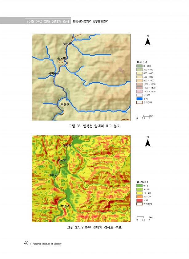 2015 DMZ 일원 생태계 조사 민통선이북지역 동부해안권역 48 ? National Institute of Ecology 그림 36. 인북천 일대의 표고 분포 그림 37. 인북천 일대의 경사도분포