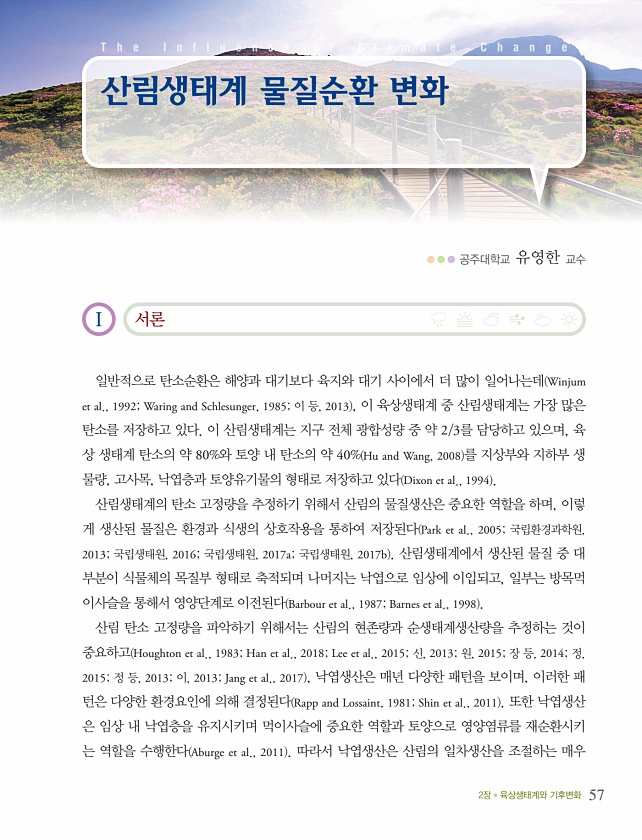 2장 육상생태계와 기후변화 57 I 서론 일반적으로 탄소순환은 해양과 대기보다 육지와 대기 사이에서 더 많이 일어나는데 Winjum et al., 1992; Waring and Schlesunger, 1985; 이 등, 2013 , 이 육상생태계 중 산림생태계는 가장 많은 탄소를 저장하고 있다. 이 산림생태계는 지구 전체 광합성량 중 약 2/3를 담당하고 있으며, 육 상 생태계 탄소의 약 80%와 토양 내 탄소의 약 40% Hu and Wang, 2008 를 지상부와 지하부 생 물량, 고사목, 낙엽층과 토양유기물의 형태로 저장하고 있다 Dixon et al., 1994 산림생태계의 탄소 고정량을 추정하기 위해서 산림의 물질생산은 중요한 역할을 하며, 이렇 게 생산된 물질은 환경과 식생의 상호작용을 통하여 저...