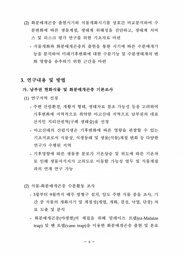 ii 2 화분매개곤충 출현시기와 식물개화시기를 상호간 비교분석하여 수 분변화에 따른 생물계절, 생태계 위해성을 진단하고, 생태계 서비 스 및 리스크 평가 연구를 위한 기초자료 마련 식물개화와 화분매개곤충의 출현을 통한 시기에 따른 수분매개기 능을 분석하여 미래기후변화에 대한 수분기능 및 수분생태계의 변 화 영향을 유추하기 위한 근간을 마련 3. 연구내용 및 방법 가. 남부권 현화식물 및 화분매개곤충 기본조사 1 연구지역 선정 주변 산림환경, 개활지 형태, 생태자료 참조 가능성 등을 고려하여 기후변화에 지역적으로 취약한 아고산대 지역으로 남부권의 대표 산지인 지리산권역 구례 생태숲 을 선정 아고산대의 산림식생은 기후변화에 따른 영향을 관찰할 수 있는 기초지표로서 식물상, 식생동태 및 생물 식물 계절 변화 등 ...
