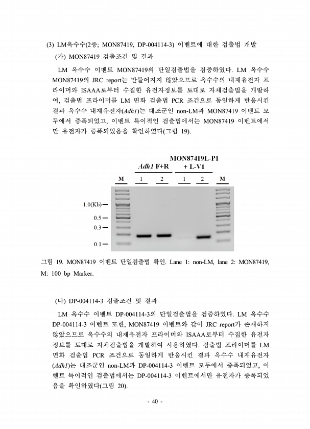 40 3 LM옥수수 2종; MON87419, DP-004114-3 이벤트에 대한 검출법 개발 가 MON87419 검출조건 및 결과 LM 옥수수 이벤트 MON87419의 단일검출법을 검증하였다. LM 옥수수 MON87419의 JRC report는 만들어지지 않았으므로 옥수수의 내재유전자 프 라이머와 ISAAA로부터 수집한 유전자정보를 토대로 자체검출법을 개발하 여, 검출법 프라이머를 LM 면화 검출법 PCR 조건으로 동일하게 반응시킨 결과 옥수수 내재유전자 Adh1 는 대조군인 non-LM과 MON87419 이벤트 모 두에서 증폭되었고, 이벤트 특이적인 검출법에서는 MON87419 이벤트에서 만 유전자가 증폭되었음을 확인하였다 그림 19 그림 19. MON87419 이벤트 단일검출법 확인. Lane 1non-...