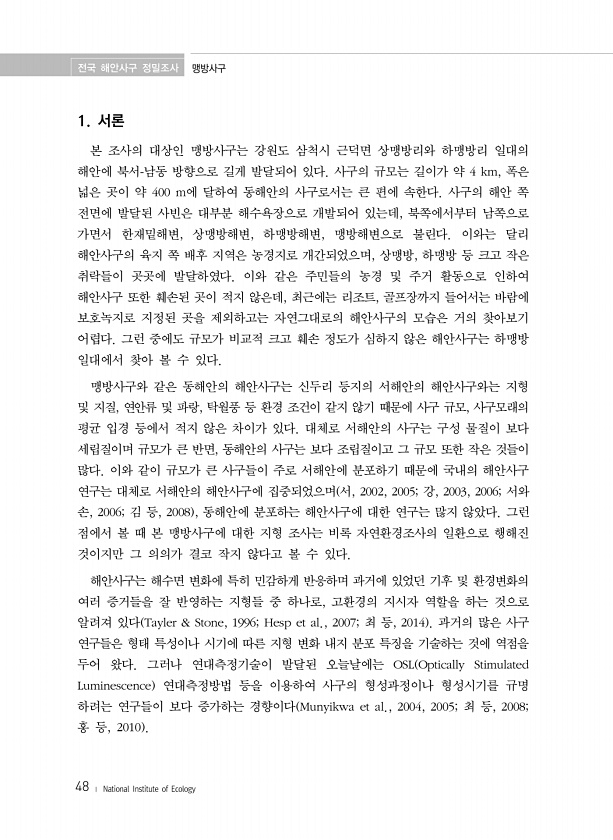 전국 해안사구 정밀조사 맹방사구 48 ? National Institute of Ecology 1. 서론 본 조사의 대상인 맹방사구는 강원도 삼척시 근덕면 상맹방리와 하맹방리 일대의 해안에 북서-남동 방향으로 길게 발달되어 있다. 사구의 규모는 길이가 약 4 km, 폭은 넓은 곳이 약 400 m에 달하여 동해안의 사구로서는 큰 편에 속한다. 사구의 해안 쪽 전면에 발달된 사빈은 대부분 해수욕장으로 개발되어 있는데, 북쪽에서부터 남쪽으로 가면서 한재밑해변, 상맹방해변, 하맹방해변, 맹방해변으로 불린다. 이와는 달리 해안사구의 육지 쪽 배후 지역은 농경지로 개간되었으며, 상맹방, 하맹방 등 크고 작은 취락들이 곳곳에 발달하였다. 이와 같은 주민들의 농경 및 주거 활동으로 인하여 해안사구 또한 훼손된 곳이 적지 ...