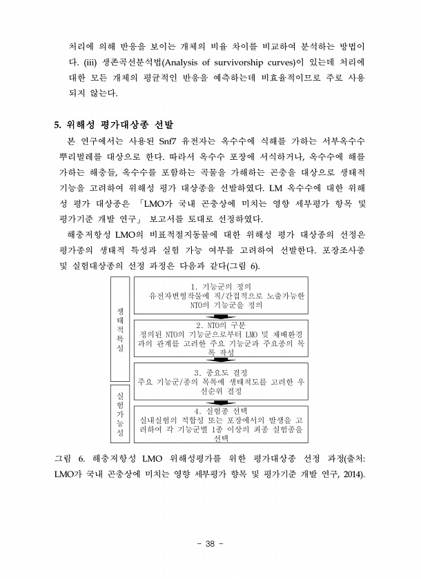 처리에 의해 반응을 보이는 개체의 비율 차이를 비교하여 분석하는 방법이 다. iii 생존곡선분석법 Analysis of survivorship curves 이 있는데 처리에 대한 모든 개체의 평균적인 반응을 예측하는데 비효율적이므로 주로 사용 되지 않는다. 5. 위해성 평가대상종 선발 본 연구에서는 사용된 Snf7 유전자는 옥수수에 식해를 가하는 서부옥수수 뿌리벌레를 대상으로 한다. 따라서 옥수수 포장에 서식하거나, 옥수수에 해를 가하는 해충들, 옥수수를 포함하는 곡물을 가해하는 곤충을 대상으로 생태적 기능을 고려하여 위해성 평가 대상종을 선발하였다. LM 옥수수에 대한 위해 성 평가 대상종은 「LMO가 국내 곤충상에 미치는 영향 세부평가 항목 및 평가기준 개발 연구」 보고서를 토대로 선정하였다. 해충저항성...