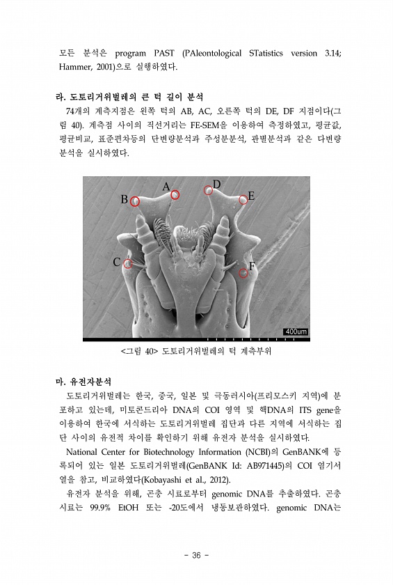 36 모든 분석은 program PAST PAleontological STatistics version 3.14; Hammer, 2001 으로 실행하였다. 라. 도토리거위벌레의 큰 턱 길이 분석 74개의 계측지점은 왼쪽 턱의 AB, AC, 오른쪽 턱의 DE, DF 지점이다 그 림 40 계측점 사이의 직선거리는 FE-SEM을 이용하여 측정하였고, 평균값, 평균비교, 표준편차등의 단변량분석과 주성분분석, 판별분석과 같은 다변량 분석을 실시하였다. 그림 40 도토리거위벌레의 턱 계측부위 마. 유전자분석 도토리거위벌레는 한국, 중국, 일본 및 극동러시아 프리모스키 지역 에 분 포하고 있는데, 미토콘드리아 DNA의 COI 영역 및 핵DNA의 ITS gene을 이용하여 한국에 서식하는 도토리거위벌레 집단과 다른 지역에...