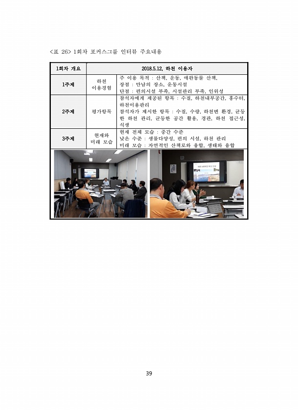 39 표 26 1회차 포커스그룹 인터뷰 주요내용 1회차 개요 2018.5.12, 하천 이용자 1주제 하천 이용경험 주 이용 목적 산책, 운동, 애완동물 산책, 장점 만남의 장소, 운동시설 단점 편의시설 부족, 시설관리 부족, 인위성 2주제 평가항목 참석자에게 제공된 항목 수질, 하천내부공간, 홍수터, 하천이용관리 참석자가 제시한 항목 수질, 수량, 하천변 환경, 균등 한 하천 관리, 균등한 공간 활용, 경관, 하천 접근성, 식생 3주제 현재와 미래 모습 현재 전체 모습 중간 수준 낮은 수준 생물다양성, 편의 시설, 하천 관리 미래 모습 자연적인 산책로와 융합, 생태와융합