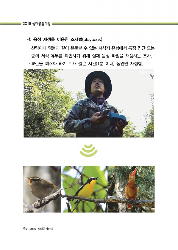58 2019 생태공감마당 ④ 음성 재생을 이용한 조사법 playback ·산림이나 덤불과 같이 은둔할 수 있는 서식지 유형에서 특정 집단 또는 종의 서식 유무를 확인하기 위해 실제 음성 파일을 재생하는 조사. ·교란을 최소화 하기 위해 짧은 시간 1분 이내 동안만재생함.
