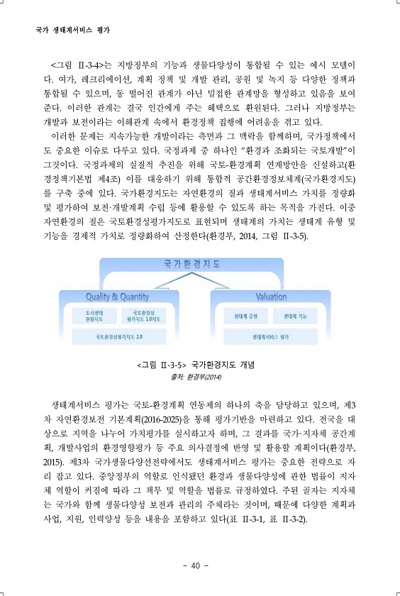 국가 생태계서비스 평가 40 그림 Ⅱ-3-4 는 지방정부의 기능과 생물다양성이 통합될 수 있는 예시 모델이 다. 여가, 레크리에이션, 계획 정책 및 개발 관리, 공원 및 녹지 등 다양한 정책과 통합될 수 있으며, 동 떨어진 관계가 아닌 밀접한 관계망을 형성하고 있음을 보여 준다. 이러한 관계는 결국 인간에게 주는 혜택으로 환원된다. 그러나 지방정부는 개발과 보전이라는 이해관계 속에서 환경정책 집행에 어려움을 겪고 있다. 이러한 문제는 지속가능한 개발이라는 측면과 그 맥락을 함께하며, 국가정책에서 도 중요한 이슈로 다루고 있다. 국정과제 중 하나인 “환경과 조화되는 국토개발”이 그것이다. 국정과제의 실질적 추진을 위해 국토-환경계획 연계방안을 신설하고 환 경정책기본법 제4조 이를 대응하기 위해 통합적 공간환경...