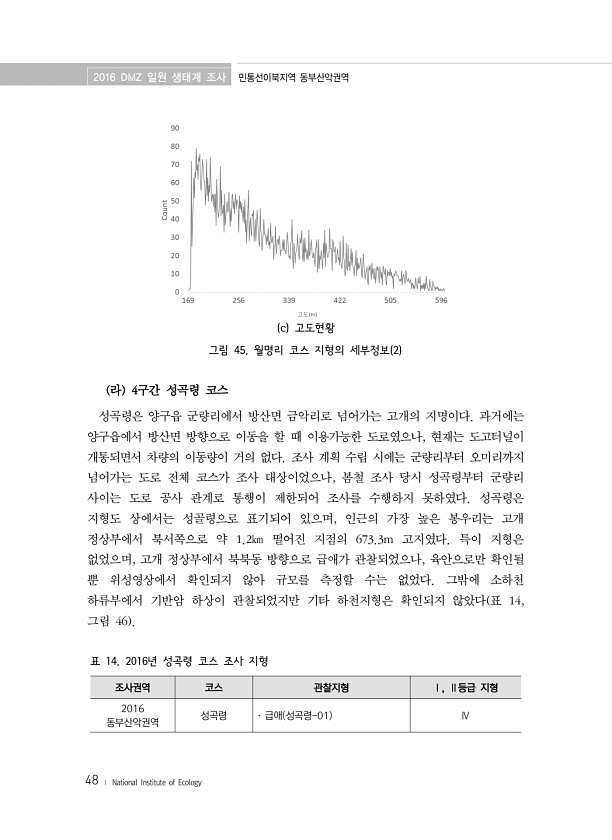 2016 DMZ 일원 생태계 조사 민통선이북지역 동부산악권역 48 ? National Institute of Ecology c 고도현황 그림 45. 월명리 코스 지형의 세부정보 2 라 4구간 성곡령 코스 성곡령은 양구읍 군량리에서 방산면 금악리로 넘어가는 고개의 지명이다. 과거에는 양구읍에서 방산면 방향으로 이동을 할 때 이용가능한 도로였으나, 현재는 도고터널이 개통되면서 차량의 이동량이 거의 없다. 조사 계획 수립 시에는 군량리부터 오미리까지 넘어가는 도로 전체 코스가 조사 대상이었으나, 봄철 조사 당시 성곡령부터 군량리 사이는 도로 공사 관계로 통행이 제한되어 조사를 수행하지 못하였다. 성곡령은 지형도 상에서는 성골령으로 표기되어 있으며, 인근의 가장 높은 봉우리는 고개 정상부에서 북서쪽으로 약 1.2㎞...