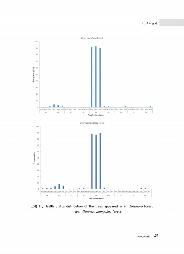 Ⅱ. 조사결과 www.nie.re.kr ? 49 그림 11. Health Status distribution of the trees appeared in P. densiflora forest and Quercus mongolicaforest.