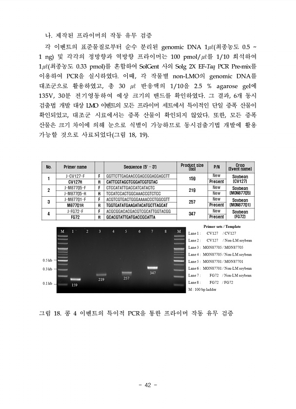 나. 제작된 프라이머의 작동 유무 검증 각 이벤트의 표준물질로부터 순수 분리된 genomic DNA 1㎕ 최종농도 0.5 1 ng 및 각각의 정방향과 역방향 프라이머는 100 pmol/㎕를 1/10 희석하여 1㎕ 최종농도 0.33 pmol 를 혼합하여 SolGent 사의 Solg 2X EF-Taq PCR Pre-mix를 이용하여 PCR을 실시하였다. 이때, 각 작물별 non-LMO의 genomic DNA를 대조군으로 활용하였고, 총 30 ㎕ 반응액의 1/10을 2.5 % agarose gel에 135V, 30분 전기영동하여 예상 크기의 밴드를 확인하였다. 그 결과, 6개 동시 검출법 개발 대상 LMO 이벤트의 모든 프라이머 세트에서 특이적인 단일 증폭 산물이 확인되었고, 대조군 시료에서는 증폭 산물이 확인되...