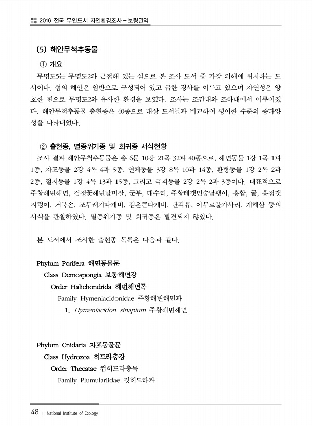 2016 전국 무인도서 자연환경조사 보령권역 48 ? National Institute of Ecology 5 해안무척추동물 ① 개요 무명도5는 무명도2와 근접해 있는 섬으로 본 조사 도서 중 가장 외해에 위치하는 도 서이다. 섬의 해안은 암반으로 구성되어 있고 급한 경사를 이루고 있으며 자연성은 양 호한 편으로 무명도2와 유사한 환경을 보였다. 조사는 조간대와 조하대에서 이루어졌 다. 해안무척추동물 출현종은 40종으로 대상 도서들과 비교하여 평이한 수준의 종다양 성을 나타내었다. ② 출현종, 멸종위기종 및 희귀종 서식현황 조사 결과 해안무척추동물은 총 6문 10강 21목 32과 40종으로, 해면동물 1강 1목 1과 1종, 자포동물 2강 4목 4과 5종, 연체동물 3강 8목 10과 14종, 환형동물 1강 2...