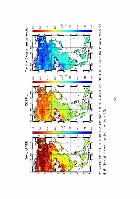38 그림 23 60년간의 동아시아 순생태계교환량 왼쪽 과 이를 이산화탄소에 의한 에너지 복사량으로 환산 가운데 하고 지표생태계 의 생지화학적인 기후조절 기능 증감 지도 작성 오른쪽