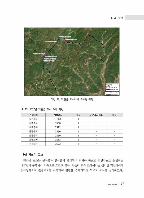 Ⅱ. 조사결과 www.nie.re.kr ? 47 그림 39. 덕현골 코스에서 조사된 지형 관찰지형 지형코드 등급 기존조사정보 등급 묵논습지 기타 Ⅲ 둠벙습지 GS50 Ⅲ 곡저평야 GS12 Ⅲ 둠벙습지 GS50 Ⅲ 둠벙습지 GS50 Ⅲ 포인트바 GS13 Ⅲ 하천습지 GS22 Ⅱ 표 13. 2017년 덕현골 코스 조사 지형 4 덕산리 코스 덕산리 코스는 연천군과 철원군의 경계부에 위치한 곳으로 임진강으로 유입되는 대교천이 동쪽에서 서쪽으로 흐르고 있다. 덕산리 코스 조사에서는 신서면 덕산리에서 동쪽방향으로 전술도로를 이용하여 철원읍 중세리까지 도보로 조사를실시하였다.