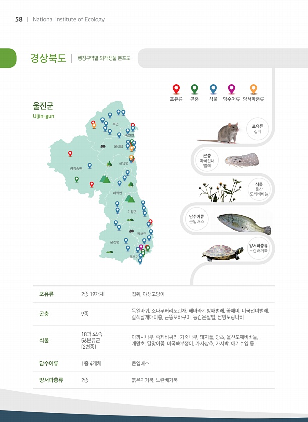 경상북도 행정구역별 외래생물 분포도 북면 금강송면 울진읍 근남면 매화면 기성면 온정면 평해면 동부면 울진군 Uljin-gun 양서파충류 노란배거북 포유류 2종 19개체 집쥐, 야생고양이 곤충 9종 독일바퀴, 소나무허리노린재, 해바라기방패벌레, 꽃매미, 미국선녀벌레, 갈색날개매미충, 큰뚱보바구미, 등검은말벌, 남방노랑나비 식물 18과 44속 56분류군 2변종 아까시나무, 족제비싸리, 가죽나무, 돼지풀, 망초, 울산도깨비바늘, 개망초, 달맞이꽃, 미국쑥부쟁이, 가시상추, 가시박, 애기수영 등 담수어류 1종 4개체 큰입배스 양서파충류 2종 붉은귀거북, 노란배거북 포유류 곤충 식물 담수어류 양서파충류 포유류 집쥐 담수어류 큰입배스 식물 울산 도깨비바늘 곤충 미국선녀 벌레 58 National Institute of...