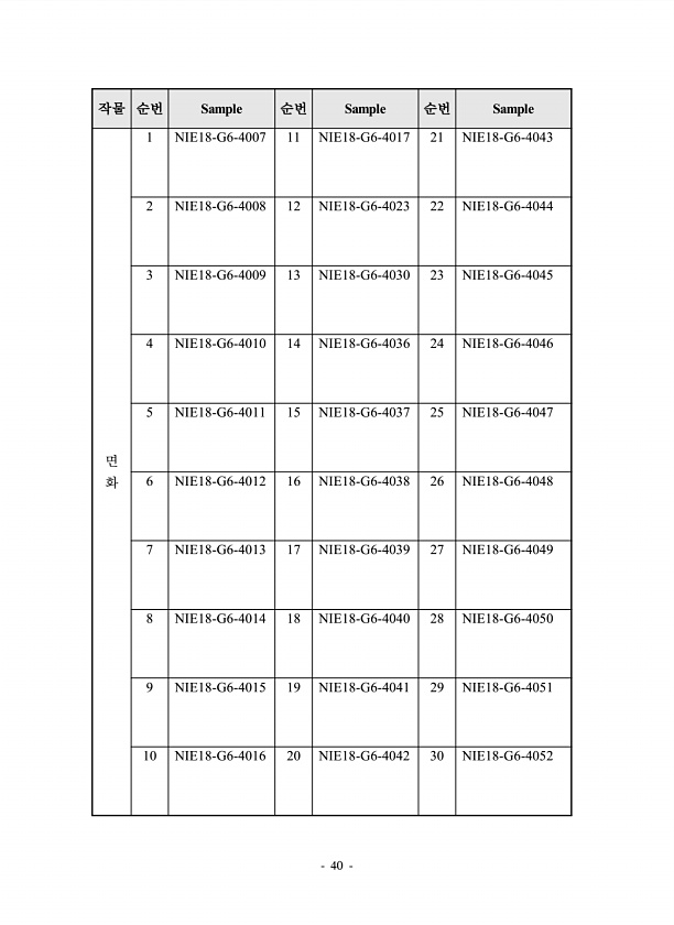 40 작물 순번 Sample 순번 Sample 순번 Sample 면 화 1 NIE18-G6-4007 11 NIE18-G6-4017 21 NIE18-G6-4043 2 NIE18-G6-4008 12 NIE18-G6-4023 22 NIE18-G6-4044 3 NIE18-G6-4009 13 NIE18-G6-4030 23 NIE18-G6-4045 4 NIE18-G6-4010 14 NIE18-G6-4036 24 NIE18-G6-4046 5 NIE18-G6-4011 15 NIE18-G6-4037 25 NIE18-G6-4047 6 NIE18-G6-4012 16 NIE18-G6-4038 26 NIE18-G6-4048 7 NIE18-G6-4013 17 NIE18-G6-4039 27 NIE18-G6-4049 8 NIE18-G6...