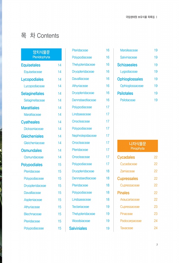 7 국립생태원 보유식물 목록집 Ⅰ Equisetales 14 Equisetaceae 14 Lycopodiales 14 Lycopodiaceae 14 Selaginellales 14 Selaginellaceae 14 Marattiales 14 Marattiaceae 14 Cyatheales 14 Dicksoniaceae 14 Gleicheniales 14 Gleicheniaceae 14 Osmundales 14 Osmundaceae 14 Polypodiales 15 Pteridaceae 15 Polypodiaceae 15 Dryopteridaceae 15 Davalliaceae 15 Aspleniaceae 15 Athyriaceae 15 Blechnaceae 15 Pteridaceae 15 Polypodiac...