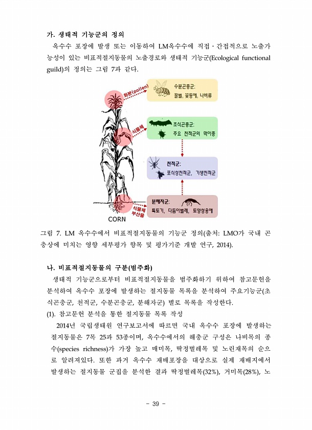 가. 생태적 기능군의 정의 옥수수 포장에 발생 또는 이동하여 LM옥수수에 직접?간접적으로 노출가 능성이 있는 비표적절지동물의 노출경로와 생태적 기능군 Ecological functional guild 의 정의는 그림 7과 같다. 그림 7. LM 옥수수에서 비표적절지동물의 기능군 정의 출처LMO가 국내 곤 충상에 미치는 영향 세부평가 향목 및 평가기준 개발 연구, 2014 나. 비표적절지동물의 구분 범주화 생태적 기능군으로부터 비표적절지동물을 범주화하기 위하여 참고문헌을 분석하여 옥수수 포장에 발생하는 절지동물 목록을 분석하여 주요기능군 초 식곤충군, 천적군, 수분곤충군, 분해자군 별로 목록을 작성한다. 1 참고문헌 분석을 통한 절지동물 목록 작성 2014년 국립생태원 연구보고서에 따르면 국내 옥수수 포장에 ...
