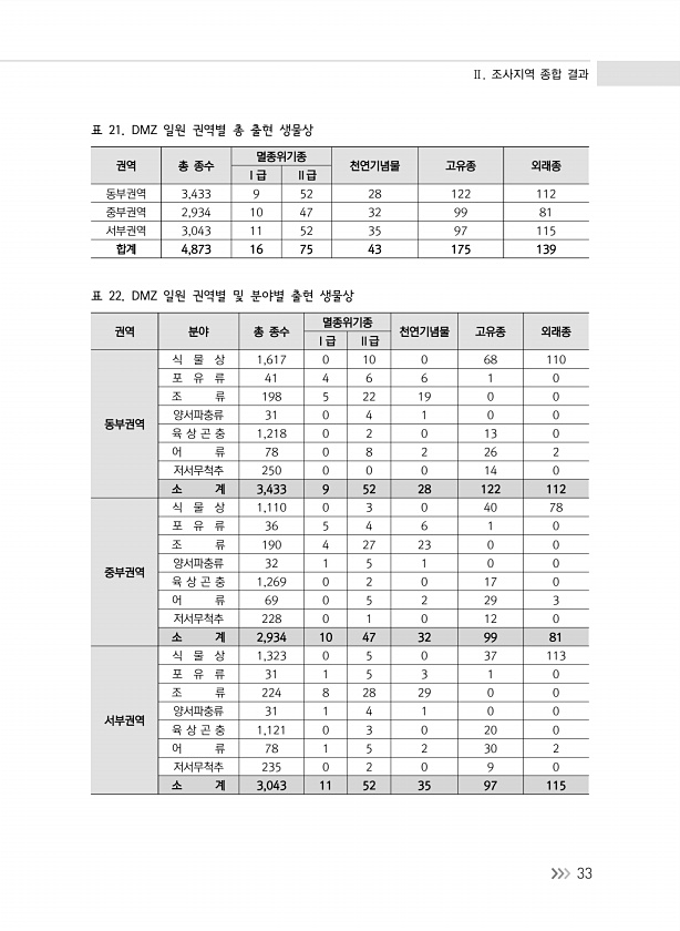 Ⅱ. 조사지역 종합 결과 33 권역 총 종수 멸종위기종 천연기념물 고유종 외래종 Ⅰ급 Ⅱ급 동부권역 3,433 9 52 28 122 112 중부권역 2,934 10 47 32 99 81 서부권역 3,043 11 52 35 97 115 합계 4,873 16 75 43 175 139 표 21. DMZ 일원 권역별 총 출현 생물상 권역 분야 총 종수 멸종위기종 천연기념물 고유종 외래종 Ⅰ급 Ⅱ급 동부권역 식 물 상 1,617 0 10 0 68 110 포 유 류 41 4 6 6 1 0 조 류 198 5 22 19 0 0 양서파충류 31 0 4 1 0 0 육 상 곤 충 1,218 0 2 0 13 0 어 류 78 0 8 2 26 2 저서무척추 250 0 0 0 14 0 소 계 3,433 9 52 28 122 112 중...