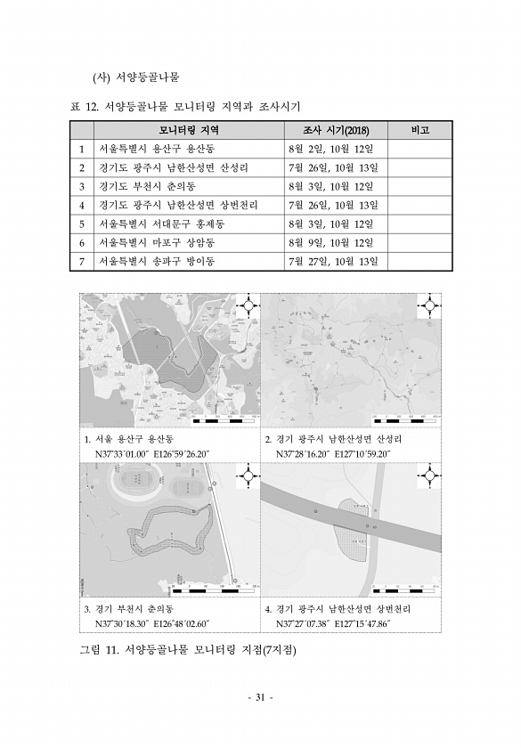 31 사 서양등골나물 모니터링 지역 조사 시기 2018 비고 1 서울특별시 용산구 용산동 8월 2일, 10월 12일 2 경기도 광주시 남한산성면 산성리 7월 26일, 10월 13일 3 경기도 부천시 춘의동 8월 3일, 10월 12일 4 경기도 광주시 남한산성면 상번천리 7월 26일, 10월 13일 5 서울특별시 서대문구 홍제동 8월 3일, 10월 12일 6 서울특별시 마포구 상암동 8월 9일, 10월 12일 7 서울특별시 송파구 방이동 7월 27일, 10월 13일 표 12. 서양등골나물 모니터링 지역과 조사시기 1. 서울 용산구 용산동 N37˚33´01.00˝ E126˚59´26.20˝ 2. 경기 광주시 남한산성면 산성리 N37˚28´16.20˝ E127˚10´59.20˝ 3. 경기 부천시 춘의동 N37˚3...