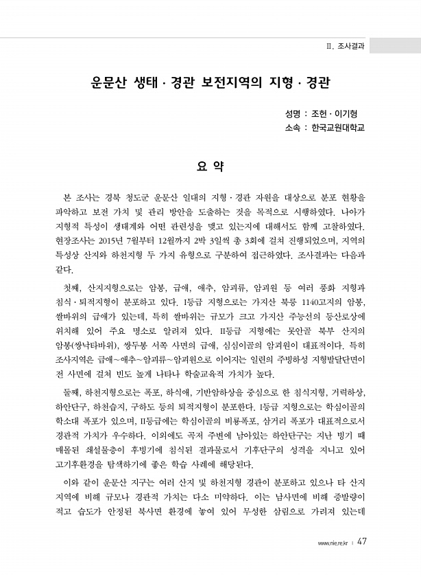 Ⅱ. 조사결과 www.nie.re.kr ? 47 운문산 생태·경관 보전지역의 지형·경관 성명 조헌 · 이기형 소속 한국교원대학교 요 약 본 조사는 경북 청도군 운문산 일대의 지형·경관 자원을 대상으로 분포 현황을 파악하고 보전 가치 및 관리 방안을 도출하는 것을 목적으로 시행하였다. 나아가 지형적 특성이 생태계와 어떤 관련성을 맺고 있는지에 대해서도 함께 고찰하였다. 현장조사는 2015년 7월부터 12월까지 2박 3일씩 총 3회에 걸쳐 진행되었으며, 지역의 특성상 산지와 하천지형 두 가지 유형으로 구분하여 접근하였다. 조사결과는 다음과 같다. 첫째, 산지지형으로는 암봉, 급애, 애추, 암괴류, 암괴원 등 여러 풍화 지형과 침식·퇴적지형이 분포하고 있다. I등급 지형으로는 가지산 북릉 1140고지의 암봉, 쌀...