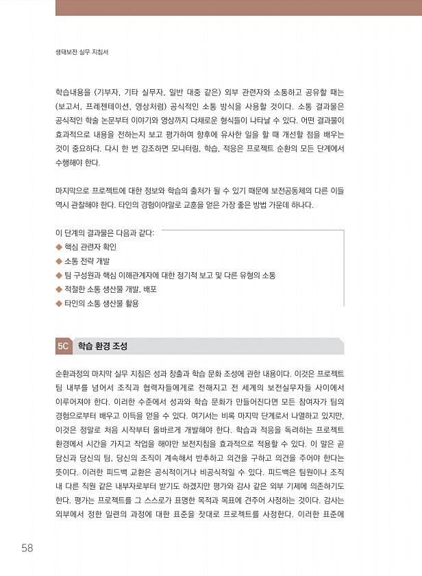 58 생태보전 실무 지침서 학습내용을 기부자, 기타 실무자, 일반 대중 같은 외부 관련자와 소통하고 공유할 때는 보고서, 프레젠테이션, 영상처럼 공식적인 소통 방식을 사용할 것이다. 소통 결과물은 공식적인 학술 논문부터 이야기와 영상까지 다채로운 형식들이 나타날 수 있다. 어떤 결과물이 효과적으로 내용을 전하는지 보고 평가하여 향후에 유사한 일을 할 때 개선할 점을 배우는 것이 중요하다. 다시 한 번 강조하면 모니터링, 학습, 적응은 프로젝트 순환의 모든 단계에서 수행해야 한다. 마지막으로 프로젝트에 대한 정보와 학습의 출처가 될 수 있기 때문에 보전공동체의 다른 이들 역시 관찰해야 한다. 타인의 경험이야말로 교훈을 얻은 가장 좋은 방법 가운데 하나다. 이 단계의 결과물은 다음과 같다◆ 핵심 관련자 확인 ◆...