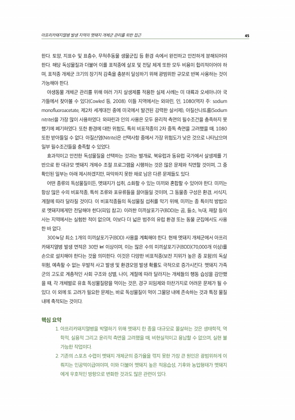 아프리카돼지열병 발생 지역의 멧돼지 개체군 관리를 위한 접근 45 한다. 토양, 지표수 및 표층수, 무척추동물 생물군집 등 환경 속에서 완전하고 안전하게 분해되어야 한다. 해당 독성물질과 더불어 이를 표적종에 살포 및 전달 체계 또한 모두 비용이 합리적이어야 하 며, 표적종 개체군 크기의 장기적 감축을 충분히 달성하기 위해 광범위한 규모로 반복 사용하는 것이 가능해야 한다. 야생동물 개체군 관리를 위해 여러 가지 살생제를 적용한 실제 사례는 미 대륙과 오세아니아 국 가들에서 찾아볼 수 있다 Cowled 등, 2008 이들 지역에서는 와파린, 인, 1080 역자 주sodium monofluoroacetate, 제2차 세계대전 중에 미국에서 발견된 강력한 살서제 , 아질산나트륨 Sodium nitrite 을 가...