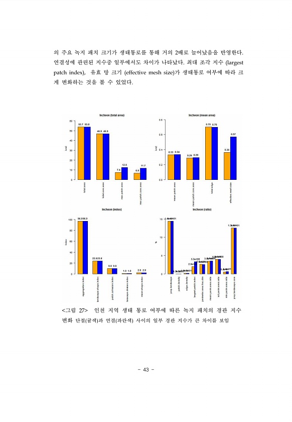 43 의 주요 녹지 패치 크기가 생태통로를 통해 거의 2배로 늘어났음을 반영한다. 연결성에 관련된 지수중 일부에서도 차이가 나타났다. 최대 조각 지수 largest patch index , 유효 망 크기 effective mesh size 가 생태통로 여부에 따라 크 게 변화하는 것을 볼 수 있었다. 그림 27 인천 지역 생태 통로 여부에 따른 녹지 패치의 경관 지수 변화 단절 귤색 과 연결 파란색 사이의 일부 경관 지수가 큰 차이를보임