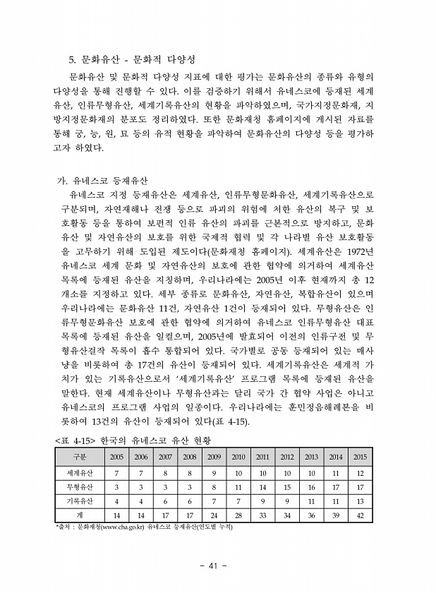 41 문화유산 문화적 다양성 문화유산 및 문화적 다양성 지표에 대한 평가는 문화유산의 종류와 유형의 다양성을 통해 진행할 수 있다 이를 검증하기 위해서 유네스코에 등재된 세계 유산 인류무형유산 세계기록유산의 현황을 파악하였으며 국가지정문화재 지 방지정문화재의 분포도 정리하였다 또한 문화재청 홈페이지에 게시된 자료를 통해 궁 능 원 묘 등의 유적 현황을 파악하여 문화유산의 다양성 등을 평가하 고자 하였다 가 유네스코 등재유산 유네스코 지정 등재유산은 세계유산 인류무형문화유산 세계기록유산으로 구분되며 자연재해나 전쟁 등으로 파괴의 위험에 처한 유산의 복구 및 보 호활동 등을 통하여 보편적 인류 유산의 파괴를 근본적으로 방지하고 문화 유산 및 자연유산의 보호를 위한 국제적 협력 및 각 나라별 유산 보호활동 을 고...