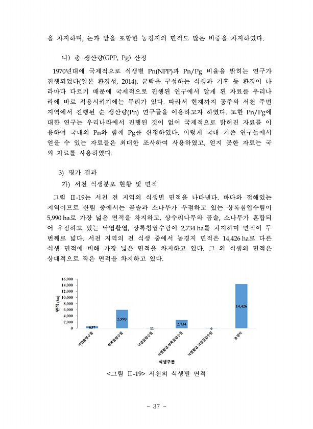 37 을 차지하며 논과 밭을 포함한 농경지의 면적도 많은 비중을 차지하였다 나 총 생산량 GPP, Pg 산정 년대에 국제적으로 식생별 과 비율을 밝히는 연구가 진행되었다 일본 환경성 군락을 구성하는 식생과 기후 등 환경이 나 라마다 다르기 때문에 국제적으로 진행된 연구에서 알게 된 자료를 우리나 라에 바로 적용시키기에는 무리가 있다 따라서 현재까지 공주와 서천 주변 지역에서 진행된 순 생산량 연구들을 이용하고자 하였다 또한 에 대한 연구는 우리나라에서 진행된 것이 없어 국제적으로 밝혀진 자료를 이 용하여 국내의 와 함께 를 산정하였다 이렇게 국내 기존 연구들에서 얻을 수 있는 자료들은 최대한 조사하여 사용하였고 얻지 못한 자료는 국 외 자료를 사용하였다 평가 결과 가 서천 식생분포 현황 및 면적 그림 는 서...