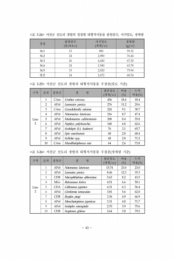 43 정점 출현종수 종/0.1㎡ 서식밀도 개체/㎡ 생체량 g/㎡ St.1 15 980 59.32 St.2 24 2,980 76.44 St.3 26 4,440 67.20 St.4 24 1,940 63.78 St.5 33 2,020 75.94 평균 24 2,472 68.54 표 3-24 서천군 선도리 갯벌의 정점별 대형저서동물 출현종수, 서식밀도, 생체량 구역 순위 분류군 종 명 평균밀도 개체/㎡ 비율 % 누적 비율 % Line 2 1 CAm Urothoe convexa 456 18.4 18.4 2 APol Leonnates persica 276 11.2 29.6 3 CAm Grandidierella minima 224 9.1 38.7 4 APol Notomastus latericeus 216 8.7 47.4 ...