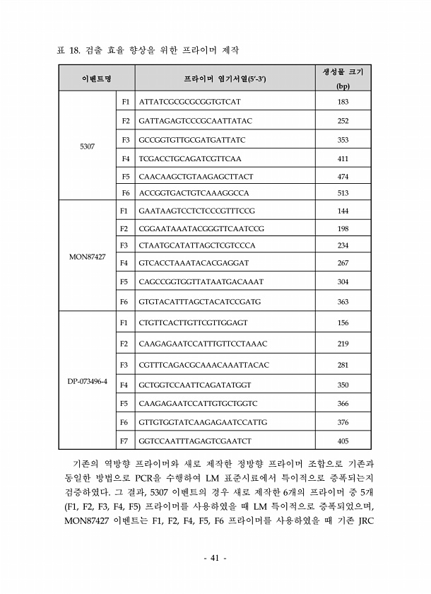 41 표 18. 검출 효율 향상을 위한 프라이머 제작 이벤트명 프라이머 염기서열 5-3생성물 크기 bp 5307 F1 ATTATCGCGCGCGGTGTCAT 183 F2 GATTAGAGTCCCGCAATTATAC 252 F3 GCCGGTGTTGCGATGATTATC 353 F4 TCGACCTGCAGATCGTTCAA 411 F5 CAACAAGCTGTAAGAGCTTACT 474 F6 ACCGGTGACTGTCAAAGGCCA 513 MON87427 F1 GAATAAGTCCTCTCCCGTTTCCG 144 F2 CGGAATAAATACGGGTTCAATCCG 198 F3 CTAATGCATATTAGCTCGTCCCA 234 F4 GTCACCTAAATACACGAGGAT 267 F5 CAGCCGGTGGTTATAATGACAAAT 304...