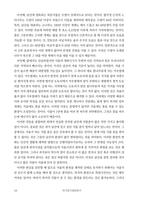 58 국가장기생태연구 다섯째, 남산에 생육하는 목본식물은 수령이 상대적으로 낮다는 것이다. 팔각정 근처의 느 티나무는 수령이 100년 이상이 되었으나 이들을 제외하면 대부분은 수령이 60년 이하이다. 특히, 남산을 대표하는 소나무는 100년 이상인 개체는 매우 드물고 40-60년생이 주를 이루 고 있다. 이러한 자료에 의하면 해방 후 또는 6.25동란 이후에 자라기 시작하였다는 것이다. 물론 그동안에도 고사한 개체는 많을 것으로 추정되나 근본적으로 볼 때 이전의 남산 모습을 가늠할 수 있을 것이다. 즉, 민둥산은 아닐지라도 숲이 우거진 모습도 물론 아닐 것으로 추정 된다. 그리고 20-40년생도 비교적 많으나 20년 이하는 거의 없다는 것이다. 일반적으로 수령 이 고루 분포하거나 어린 개체가 많아야 안정된 ...