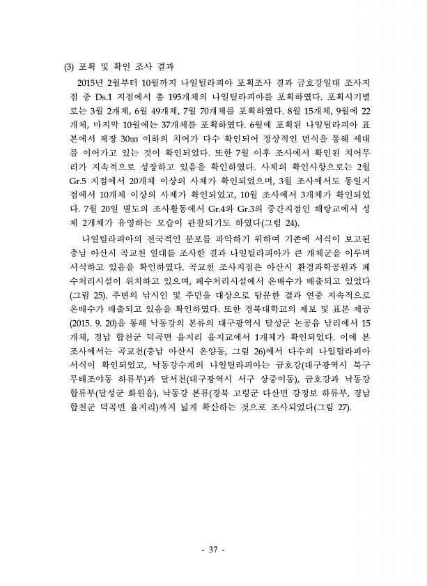 37 3 포획 및 확인 조사 결과 2015년 2월부터 10월까지 나일틸라피아 포획조사 결과 금호강일대 조사지 점 중 Ds.1 지점에서 총 195개체의 나일틸라피아를 포획하였다. 포획시기별 로는 3월 2개체, 6월 49개체, 7월 70개체를 포획하였다. 8월 15개체, 9월에 22 개체, 마지막 10월에는 37개체를 포획하였다. 6월에 포획된 나일틸라피아 표 본에서 체장 30㎜ 이하의 치어가 다수 확인되어 정상적인 번식을 통해 세대 를 이어가고 있는 것이 확인되었다. 또한 7월 이후 조사에서 확인된 치어무 리가 지속적으로 성장하고 있음을 확인하였다. 사체의 확인사항으로는 2월 Gr.5 지점에서 20개체 이상의 사체가 확인되었으며, 3월 조사에서도 동일지 점에서 10개체 이상의 사체가 확인되었고, 10월 조사에...