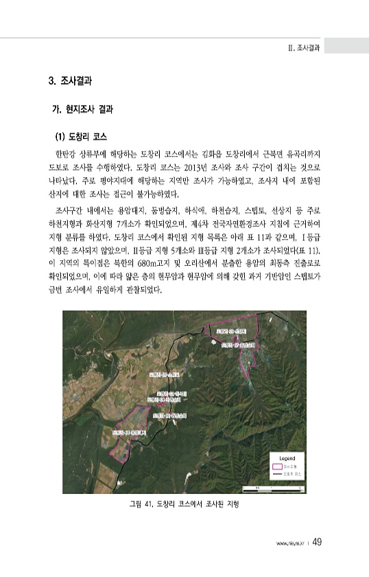 Ⅱ. 조사결과 www.nie.re.kr ? 49 3. 조사결과 가. 현지조사 결과 1 도창리 코스 한탄강 상류부에 해당하는 도창리 코스에서는 김화읍 도창리에서 근북면 유곡리까지 도보로 조사를 수행하였다. 도창리 코스는 2013년 조사와 조사 구간이 겹치는 것으로 나타났다. 주로 평야지대에 해당하는 지역만 조사가 가능하였고, 조사지 내에 포함된 산지에 대한 조사는 접근이 불가능하였다. 조사구간 내에서는 용암대지, 둠벙습지, 하식애, 하천습지, 스텝토, 선상지 등 주로 하천지형과 화산지형 7개소가 확인되었으며, 제4차 전국자연환경조사 지침에 근거하여 지형 분류를 하였다. 도창리 코스에서 확인된 지형 목록은 아래 표 11과 같으며, Ⅰ등급 지형은 조사되지 않았으며, Ⅱ등급 지형 5개소와 Ⅲ등급 지형 2개소가 조사...