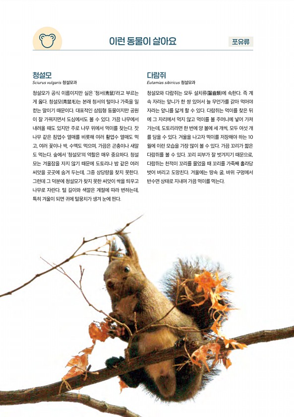 056 이런 동물이 살아요 포유류 다람쥐 Eutamias sibiricus 청설모과 청설모와 다람쥐는 모두 설치류 齧齒類 에 속한다. 즉 계 속 자라는 앞니가 한 쌍 있어서 늘 무언가를 갉아 먹어야 자라는 앞니를 닳게 할 수 있다. 다람쥐는 먹이를 찾은 뒤 에 그 자리에서 먹지 않고 먹이를 볼 주머니에 넣어 가져 가는데, 도토리라면 한 번에 양 볼에 세 개씩, 모두 여섯 개 를 담을 수 있다. 겨울을 나고자 먹이를 저장해야 하는 10 월에 이런 모습을 가장 많이 볼 수 있다. 가끔 꼬리가 짧은 다람쥐를 볼 수 있다. 꼬리 피부가 잘 벗겨지기 때문으로, 다람쥐는 천적이 꼬리를 물었을 때 꼬리를 가죽째 홀라당 벗어 버리고 도망친다. 겨울에는 땅속 굴, 바위 구멍에서 반수면 상태로 지내며 가끔 먹이를 먹는다. 청...