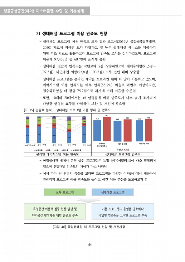 생물공생공간 야외 마스터플랜 수립 및 기본설계 44 2 생태해설 프로그램 이용 만족도 현황 생태해설 프로그램 이용 만족도 조사 결과 보고서 2019년 종합 국립생태원, 2020 자료에 의하면 보다 다양하고 질 높은 생태해설 서비스를 제공하기 위한 기초 자료로 활용하고자 프로그램 만족도 조사를 실시하였으며, 프로그램 이용자 97,458명 중 607명이 조사에 응함 생태해설 전반적 만족도는 작년보다 2점 상승하였으며 재이용의향 91.5점→ 92.3점 , 타인추천 의향 92.8점→ 93.5점 모두 전년 대비 상승함 생태해설 프로그램은 온라인 예약을 오프라인 대비 더 많이 이용하고 있으며, 예약시스템 이용 만족도는 매우 만족 55.2% 비율로 과반수 이상이지만, 점수화하였을 때 평균 75.7점으로 과거에 비해 미흡...