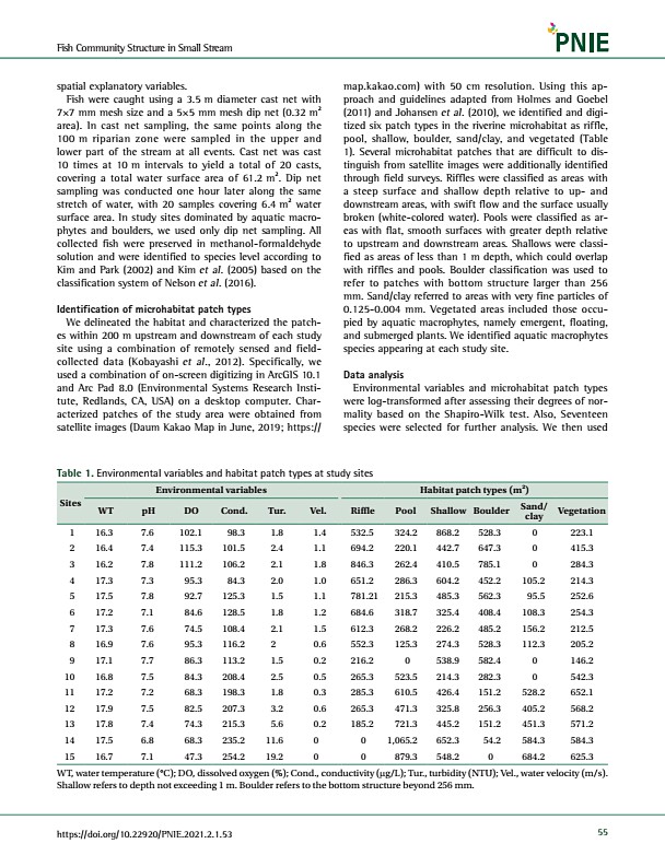 Fish Community Structure in Small Stream https//doi.org/10.22920/PNIE.2021.2.1.53 55 spatial explanatory variables. Fish were caught using a 3.5 m diameter cast net with 7×7 mm mesh size and a 5×5 mm mesh dip net 0.32 m2 area In cast net sampling, the same points along the 100 m riparian zone were sampled in the upper and lower part of the stream at all events. Cast net was cast 10 times at 10 m i...