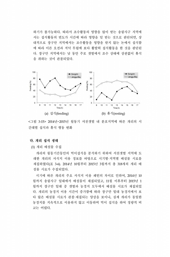 하기가 불가능하다. 따라서 조수활동의 영향을 많이 받는 송림사구 지역에 서는 섭식활동의 빈도가 시간에 따라 영향을 덜 받는 것으로 판단되면, 상 대적으로 장구만 지역에서는 조수활동을 영향을 받지 않는 논에서 섭식함 에 따라 이른 오전과 저녁 무렵에 보다 활발히 섭식활동을 한 것을 판단된 다. 장구만 지역에서는 낮 동안 주로 갯벌에서 조수 상태에 상관없이 휴식 을 취하는 것이 관찰되었다. a 섭식 feeding b 휴식 resting 그림 3-15 2014년2015년 월동기 서천갯벌 내 분포지역에 따른 개리의 시 간대별 섭식과 휴식 행동 변화 다. 개리 섭식 생태 1 개리 배설물 수집 개리의 월동기간동안의 먹이섭식을 분석하기 위하여 서천갯벌 지역에 도 래한 개리의 서식지 이용 정보를 바탕으로 시기별·지역별 배...
