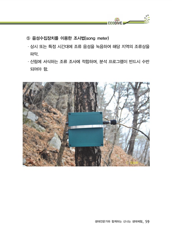 생태전문가와 함께하는 신나는 생태체험_ 59 ⑤ 음성수집장치를 이용한 조사법 song meter ·상시 또는 특정 시간대에 조류 음성을 녹음하여 해당 지역의 조류상을 파악. ·산림에 서식하는 조류 조사에 적합하며, 분석 프로그램이 반드시 수반 되어야 함. ?유승화