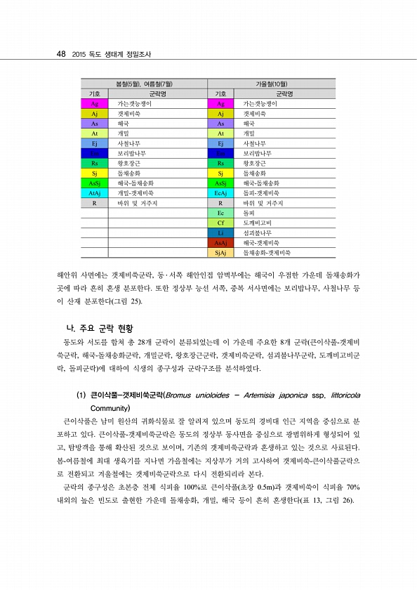 48 2015 독도 생태계 정밀조사 해안위 사면에는 갯제비쑥군락, 동 ? 서쪽 해안인접 암벽부에는 해국이 우점한 가운데 돌채송화가 곳에 따라 흔히 혼생 분포한다. 또한 정상부 능선 서쪽, 중복 서사면에는 보리밥나무, 사철나무 등 이 산재 분포한다 그림 25 나. 주요 군락 현황 동도와 서도를 합쳐 총 28개 군락이 분류되었는데 이 가운데 주요한 8개 군락 큰이삭풀-갯제비 쑥군락, 해국-돌채송화군락, 개밀군락, 왕호장근군락, 갯제비쑥군락, 섬괴불나무군락, 도깨비고비군 락, 돌피군락 에 대하여 식생의 종구성과 군락구조를 분석하였다. 1 큰이삭풀-갯제비쑥군락 Bromus unioloides Artemisia japonica ssp. littoricola Community 큰이삭풀은 남미 원산의 귀화식물로 잘 알려...